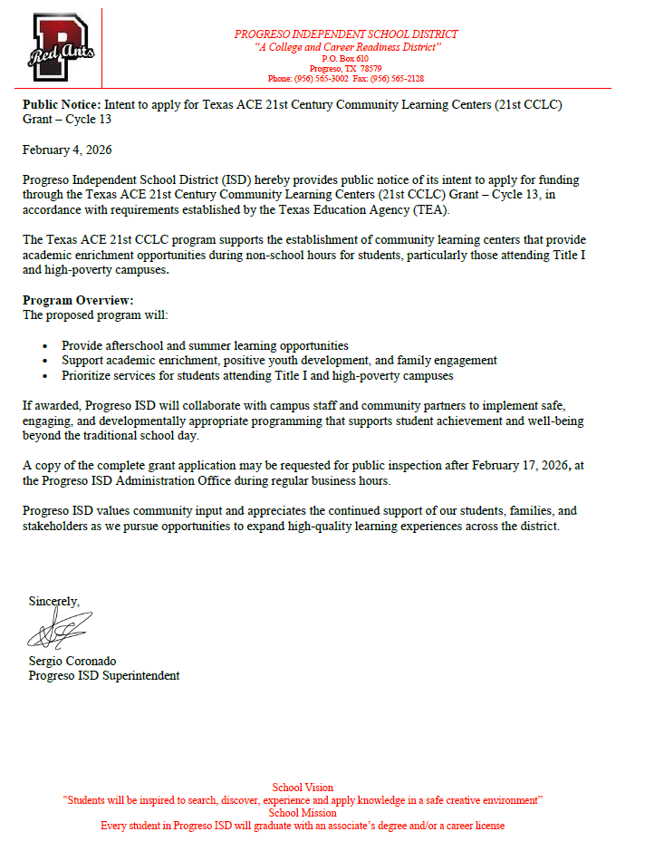 Progreso Independent School District, an Equal Opportunity Employer. It is our policy to consider all applicants without regard to race, color, religion, sex, national origin, age, marital or veteran status, or the presence of a non-job related medical condition or disability.